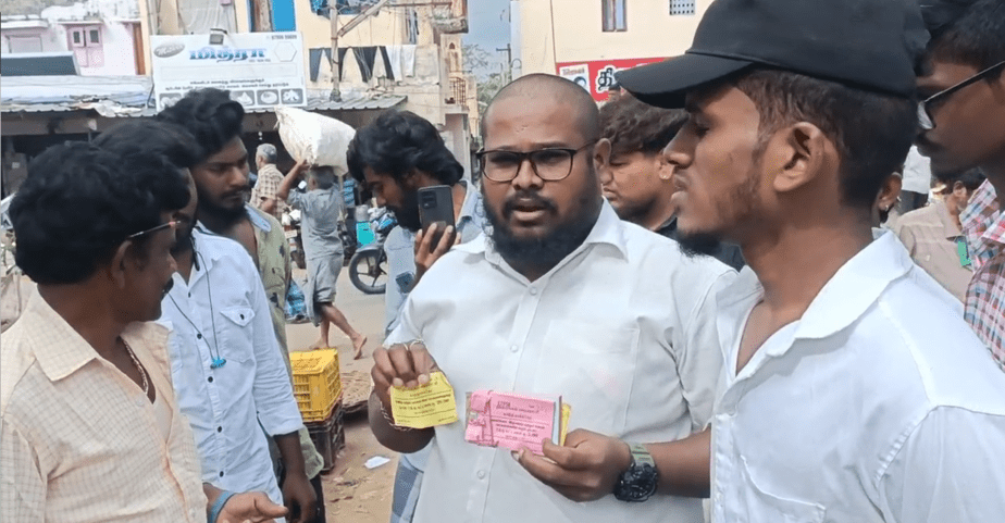 போலி ரசீது மூலம் கட்டணம் வசூலிக்கும் திமுக பிரமுகர் ; காந்தி மார்க்கெட்டில் மக்கள் ஜனநாயக கட்சியினர் முற்றுகை போராட்டம்!!