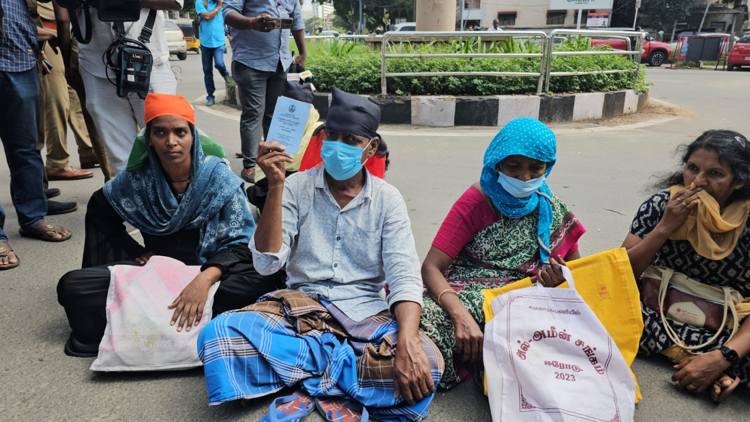 அப்போது அப்பெண் அவரது தலையில் தேசிய கொடியை கட்டிக்கொண்டும் அவரது உறவினர்கள் திமுக கொடியை கட்டிக்கொண்டும் சாலை மறியலில் ஈடுபட்டனர்.