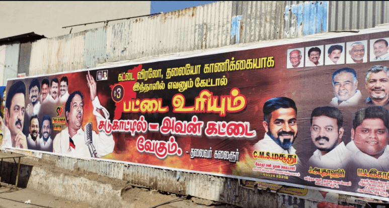 அதன் ஒரு பகுதியாக, கோவை மாநகர் தெற்கு மாவட்ட இளைஞரணி சார்பில் ரயில் நிலையம், காந்திபுரம், உக்கடம் போன்ற பகுதிகளில், கலைஞர் சாதிய அடக்குமுறை பற்றி பேசிய வசனமான “கட்டை விரலோ, தலையோ காணிக்கையாக இந்நாளில் எவனும் கேட்டால் பட்டை உரியும் சுடுகாட்டில் அவன் கட்டை வேகும்,” என்ற வரிகளை போஸ்டராக ஒட்டியுள்ளனர்.