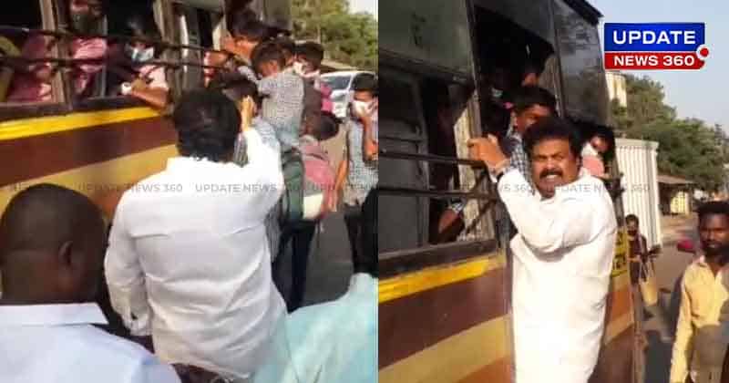 அந்த நேரத்தில் பூண்டியில் இருந்து புறப்பட வேண்டிய பேருந்து அங்கு வந்து நின்றது. அதில் மாணவர்கள் முண்டியடித்து ஏறினார்கள். அப்போது மாணவர்கள் பயணம் செய்த பஸ்சில் படிக்கட்டில் தொங்கியபடி எம்.எல்.ஏ. வி.ஜி.ராஜேந்திரன் மற்றும் தி.மு.க. நிர்வாகிகள் பயணம் செய்தனர்.