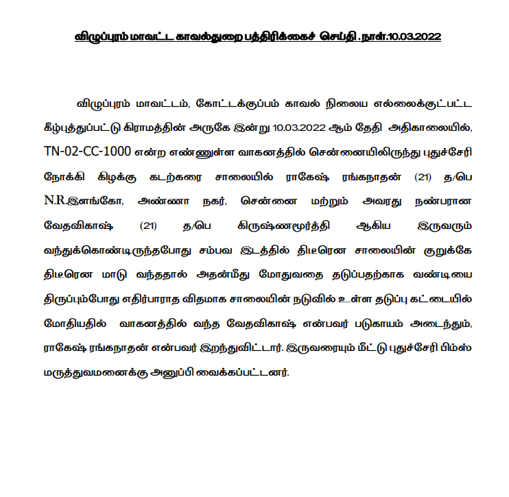 விழுப்புரம் மாவட்டம் கோட்டகுப்பம் அடுத்த கீழ்புத்துபட்டு அருகே வந்துகொண்டிருந்த பொழுது எதிர்பாராத விதமாக சென்டர் மீடியனில் மோதி கார் உருகுலைந்தது. இதில் பயணம் செய்த திமுக எம்.பி.என்.ஆர் இளங்கோ மகன் ராகேஷ் சம்பவ இடத்திலேயே பலியானார்.