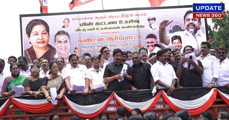 கோவை தெற்கு வட்டாச்சியர் அலுவலகம் முன்பு மின்கட்டண உயர்வை கண்டித்து அதிமுக சார்பில் நடைபெற்ற ஆர்ப்பாட்டத்தில் ஆயிரத்திற்கும் மேற்பட்டோர் கலந்து கொண்டு தமிழக அரசுக்கு எதிராக முழக்கமிட்டனர்.