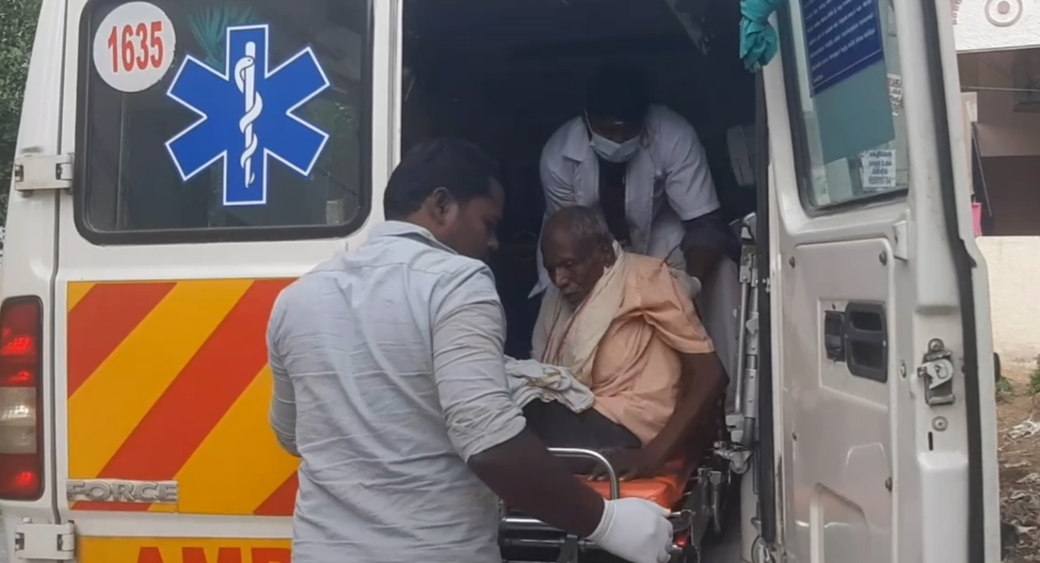 அவரது உறவினர்களுக்கும் தகவல் தெரிவித்துள்ளனர். ஆனால் நேற்று காலை வரை அவரை மீட்க எந்த பிள்ளைகளும், கருத்து வேறுபாடு காரணமாக முன் வராததால், அப்பகுதி மக்கள் தர்மபுரி மாவட்ட ஆட்சியர் சாந்தி, மாவட்ட காவல் கண்காணிப்பாளர் ஸ்டீபன் ஜேசுபாதம், இருவருக்கும் தகவல் அளித்தனர். தகவலின் பேரில் உடனடியாக 108 ஆம்புலன்ஸ் வாகனம் மூலம் அந்த முதியவரை மீட்டு ஆம்புலன்ஸ் வாகனத்தில் முதலுதவி சிகிச்சை அளித்து, தர்மபுரி அரசு மருத்துவகல்லூரி மருத்துவமனையில் சிகிச்சைக்காக ஆம்புலன்ஸ் வாகனத்தில் அழைத்து செல்லப்பட்டார்.