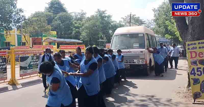 ஆம்புலன்ஸ் வாகனத்தை முன்புறம் 30க்கும் மேற்பட்ட பெண் பணியாளர்கள் இழுக்க வாகனத்தின் பின்புறம் ஆண் பணியாளர்கள் அதை தள்ளிக்கொண்டு ” ஏய் இழூ ஏய் தள்ளு” என ஆரவாரம் செய்து கொண்டு சுமார் அரை கிலோ மீட்டர் இழுத்து வந்த சம்பவம் அவ்வழியாக சென்ற வாகன ஓட்டிகள் மத்தியில் சி அதிர்ச்சியை