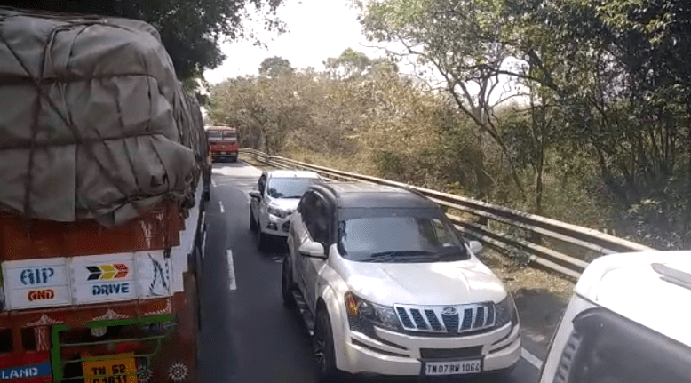 ஏற்கனவே Traffic இதுல இது வேறயா… திம்பத்தில் திரும்ப முடியாமல் திணறிய சரக்கு லாரி : 3 மணி நேரம் போக்குவரத்து பாதிப்பு!!
