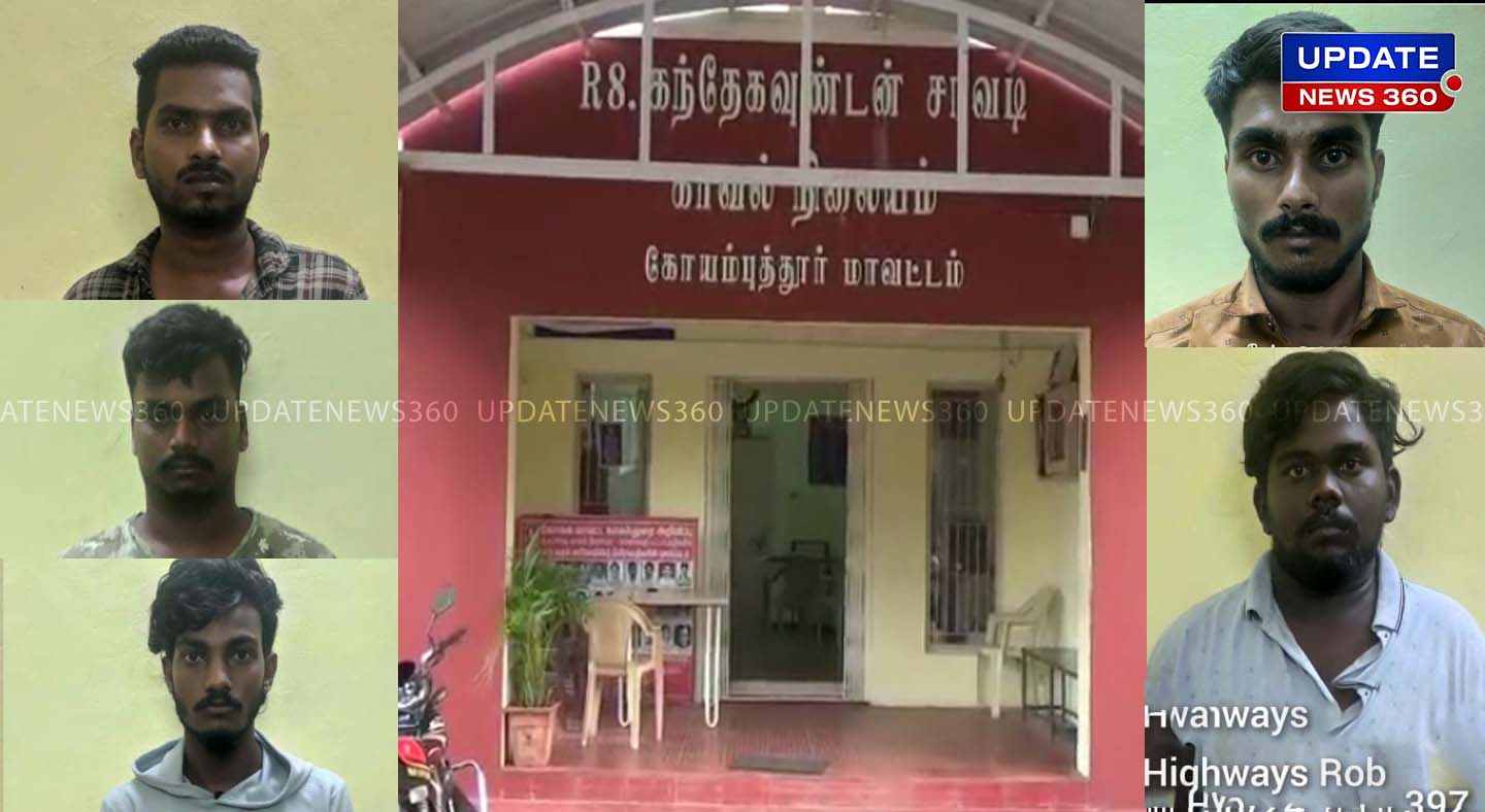 இந்நிலையில் அந்த கும்பலை மடக்கி பிடித்த கேரளா – தமிழக எல்லை அருகில் உள்ள கந்தே கவுண்டன் சாவடி காவல் துறையினர் கைது செய்து அவர்களிடம் நடத்திய விசாரணையில் கோவை கந்தேகவுண்டன் சாவடி பகுதியைச் சேர்ந்த சபரீஷ், கிணத்துக்கடவு பகுதியைச் சேர்ந்த கருவாச்சி (எ) குரு பிரகாஷ், உடுமலைப் பகுதியைச் சேர்ந்த சூர்யா, நாகராஜ் மற்றும் கேரள மாநிலத்தைச் சேர்ந்த தடியன் (எ) சிவா ஆகியோர் இந்த குற்ற செயலில் ஈடுபட்டது தெரிய வந்தது.