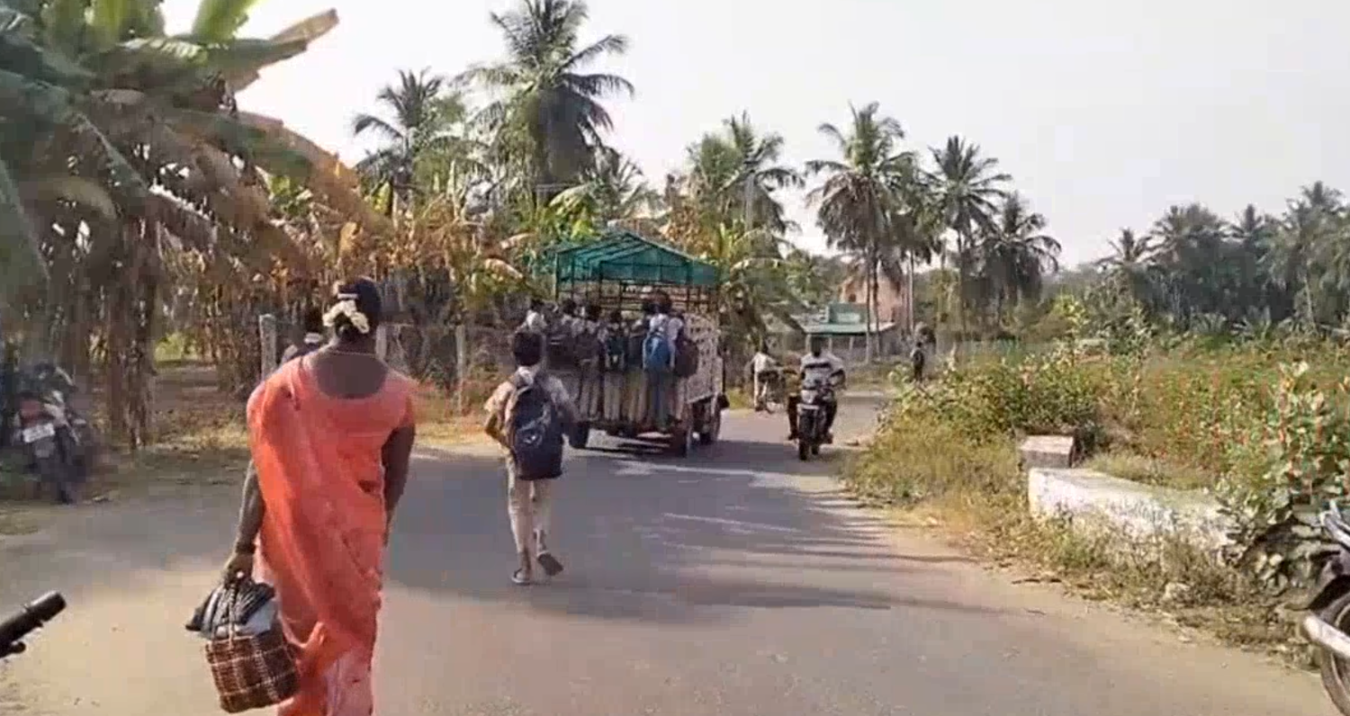 சுதந்திரம் பெற்றதில் இருந்து முதல்முறையாக கிராமத்திற்கு விடப்பட்ட அரசுப் பேருந்து, ஒரு மணி நேரம் தாமதமாக வந்ததால், அதிருப்தியடைந்த மாணவ, மாணவிகள், ஆபத்தான முறையில் பால் வண்டியில் தொங்கிச் சென்றுள்ளனர்.