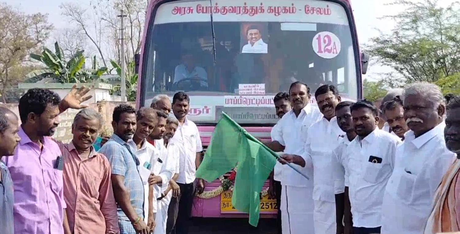 இதனையடுத்து, பேருந்தை பாப்பிரெட்டிப்பட்டி திமுக கிழக்கு ஒன்றிய செயலாளர் முத்துக்குமார் மற்றும் மாநில வர்த்தக அணி துணைச் செயலாளர் மெடிக்கல் சத்தியமூர்த்தி, ஊராட்சி மன்ற தலைவர் கலந்துகொண்டு பேருந்து சேவையை கொடியசைத்து துவக்கி வைத்தனர். இதில் ஏராளமான பொதுமக்கள் பலர் கலந்து கொண்டனர்