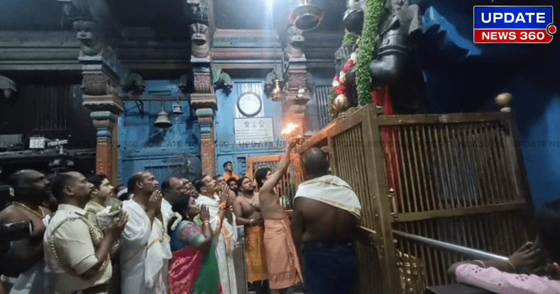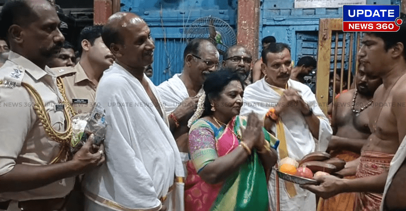 சுசீந்திரத்தில் உள்ள தாணுமாலய சுவாமி கோவிலுக்கு சென்று சாமி கும்பிட்ட அவரை மாவட்ட ஆட்சித் தலைவர் ஸ்ரீதர் பூச்செண்டு கொடுத்து வரவேற்றார்.
