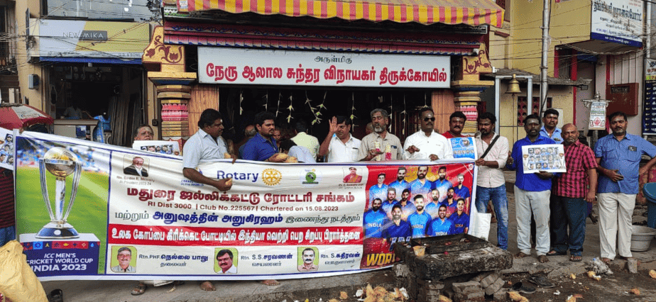 மதுரை வடக்கு மாசி வீதி மேலமாசி வீதி சந்திப்பில் உள்ள நேரு ஆலால சுந்தர விநாயகர் திருக்கோவிலில் நாளை நடைபெற உள்ள உலகக் கோப்பை கிரிக்கெட் போட்டியில் இந்தியா வெற்றி பெற ஜல்லிக்கட்டு ரோட்டரி சங்கம் சார்பில் பொதுமக்களோடு ஒன்றிணைந்து தேங்காய் உடைத்து சிறப்பு வழிபாடு நடத்தி வருகின்றனர்