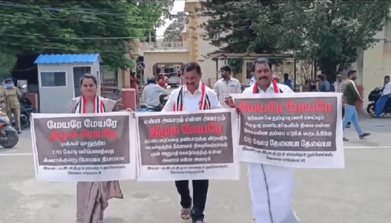 முன்னதாக இந்த கூட்டத்திற்கு வந்த அதிமுக உறுப்பினர்கள் பிரபாகரன், சர்மிளா சந்திரசேகர், ரமேஷ் ஆகியோர் மாநகராட்சி கவுன்சிலர்களின் அனுமதி பெறாமல் 170 கோடி ரூபாய் பணத்தை கையாள்வதற்கான அனுமதியை தனியாருக்கு மேயர் கல்பனா அளித்து இருப்பதாக குற்றம் சாட்டினர். மேலும் இதற்கு எதிர்ப்பு தெரிவித்து, கையில் பதாகையுடன் மன்ற அரங்கு முன்பாக ஆர்ப்பாட்டத்திலும் ஈடுபட்டனர்.