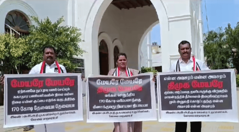 குப்பைகளை எடுக்க டெண்டர் வழங்கியதில் முறைகேடு? கோவை மேயருக்கு எதிராக அதிமுக கவுன்சிலர்கள் போராட்டம்!!!