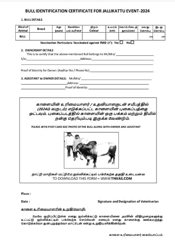 ஜல்லிக்கட்டு போட்டிகளில் பங்கேற்க வரும் காளைகளின் உரிமையாளர்கள் நடப்பு 2024 ஆம் ஆண்டிற்கான ஜல்லிக்கட்டு மாடு மற்றும் நாட்டின் உரிமையாளர் மற்றும் உதவியாளர் உடன் கூடிய புதிய புகைப்படமும், ஜல்லிக்கட்டு மாடுகளுக்கு போதை வஸ்துகள் தரமாட்டேன் மற்றும் துன்புறுத்த மாட்டேன் என்று உறுதிமொழி பதிவு செய்து வழங்கவும் அறிவுறுத்தப்பட்டுள்ளது.