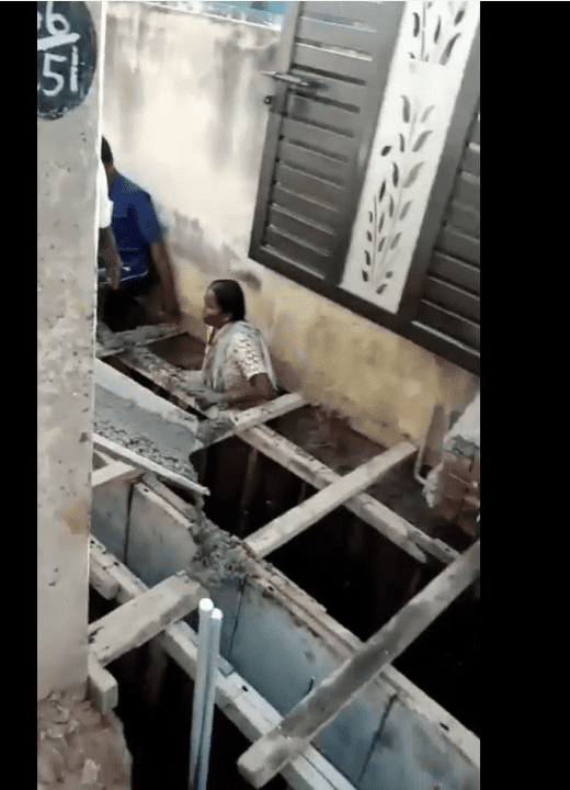 அதை பொருட்படுத்தாமல் ஒப்பந்ததாரர் அவர்கள் மீது கான்கிரீட் சிமெண்ட் கலவையை கொட்டியது பரபரப்பை ஏற்படுத்தியது. இந்த வீடியோ சமூக வலைதளங்களில் வைரலான நிலையில் மாநகராட்சி அதிகாரிகள் சம்பவ இடத்திற்கு சென்று ஒப்பந்ததாரரிடம் அப்பகுதியில் காங்கிரிட் அமைத்து தரும்படி அறிவுறுத்திச் சென்றனர்.