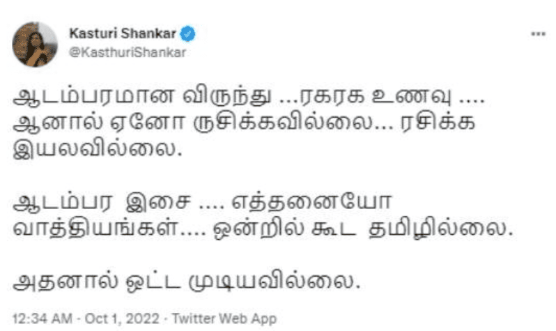 இந்நிலையில், ப்ளூ சட்டை மாறனை தொடர்ந்து நடிகை கஸ்தூரியும் நெகட்டிவ் விமர்சனத்தை கொடுத்திருப்பது ரசிகர்களை மேலும் கடுப்பில் ஆழ்த்தி உள்ளது. எதிர்பார்த்த அளவுக்கு பொன்னியின் செல்வன் படத்தை மணிரத்னம் எடுக்கவில்லை என்றும் பாடல்களில் தமிழையே காணோம் என இசையமைப்பாளர் ஏ.ஆர். ரஹ்மானையும் மறைமுகமாக சாடி உள்ளார்.