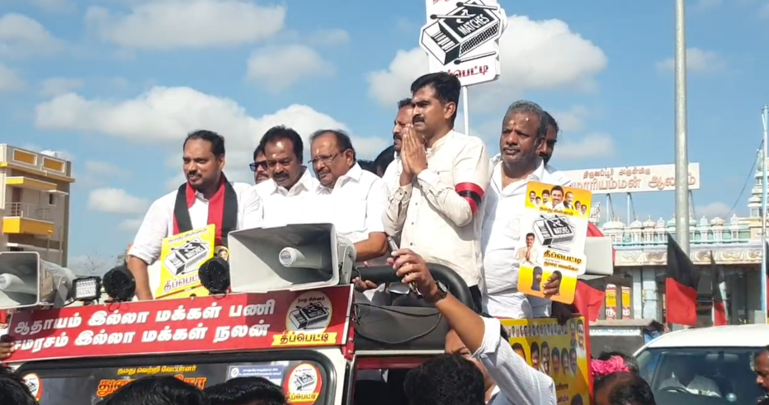 திறந்தவெளி ஜீப்பில் சட்டத்துறை அமைச்சர் ரகுபதி மற்றும் வேட்பாளர் துரை வைகோ ஆகியோர் திருவப்பூர் கோவில்பட்டி காட்டு மாரியம்மன் கோவில் தெரு உள்ளிட்ட பல்வேறு பகுதிகளில் வாக்குகளை சேகரித்தனர்.