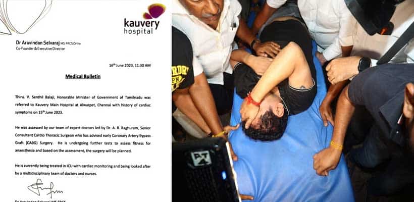 இந்த நிலையில், செந்தில் பாலாஜிக்கு அறுவை சிகிச்சை செய்வது தொடர்பாக காவேரி மருத்துவமனை நிர்வாகம் அறிக்கை வெளியிட்டுள்ளது. அதில், செந்தில் பாலாஜிக்கு அறுவை சிகிச்சை செய்வதற்காக பல்வேறு பரிசோதனைகள் நடத்தப்பட்டு வருவதாகவும், கூடிய விரைவில் பைபாஸ் சிகிச்சை செய்ய ஏஆர் ரகுராம் குழு பரிந்துரைத்துள்ளதாகவும் குறிப்பிடப்பட்டுள்ளது.