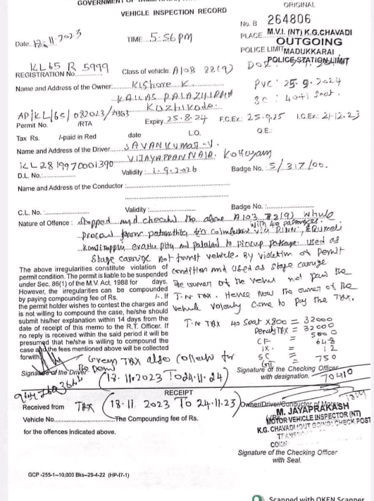 கேரள மாநிலம் பத்தினம்திட்டாவில் இருந்து கோவைக்கு இயக்கப்பட்ட ராபின் டிராவல்ஸ் பேருந்துக்கு – தமிழக போக்குவரத்து துறை சார்பில் 70,410 ரூபாய் அபராதம் விதிக்கப்பட்டது.