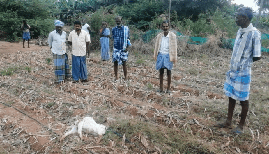 மேய்ச்சலுக்காக தோட்டத்திற்குள் ஆடுகளை கட்டி வைத்துவிட்டு உறங்கச் சென்றார். இன்று அதிகாலை சென்று பார்த்த பொழுது 5 ஆடுகள் இறந்து கிடந்ததை கண்டு அதிர்ச்சி அடைந்தார்.