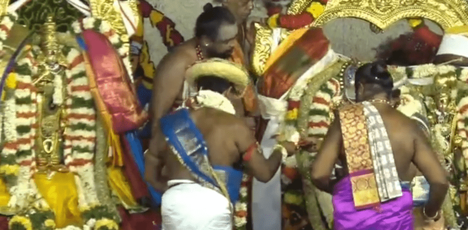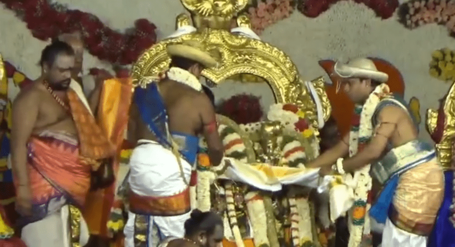 இதையடுத்து, மதுரை மல்லிகை, கனகாம்பரம், சம்பங்கி, பெங்களூரு ரோஜா, தாய்லாந்து நாட்டிலிருந்து வரவழைக்கப்பட்ட ஆா்க்கிட் போன்ற 10 டன் மலா்களைக் கொண்டு திருக்கல்யாண மேடை அலங்காரம் செய்யப்பட்டிருந்தது.