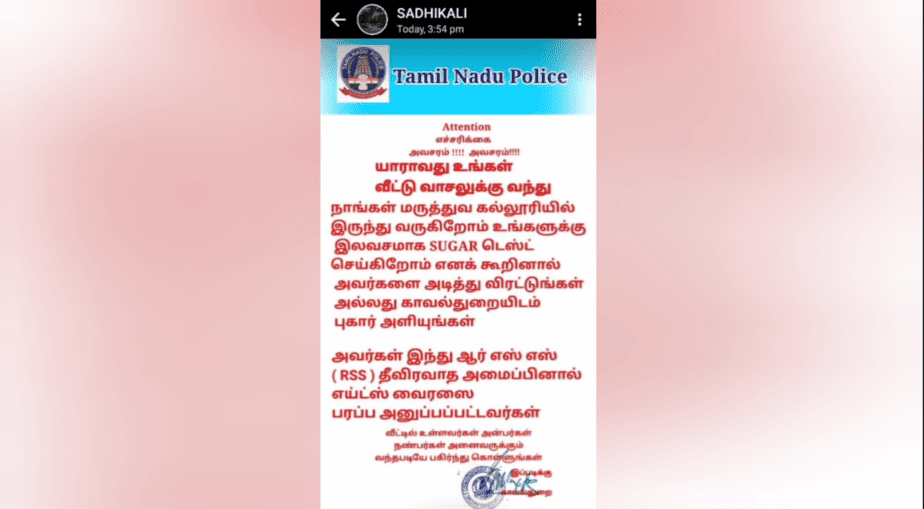 அல்லது காவல்துறையிடம் புகார் அளியுங்கள் என்றும், அவர்கள் ஹிந்து, ஆர்எஸ்எஸ் தீவிரவாத அமைப்பினால் எய்ட்ஸ் வைரஸை பரப்புவதற்காக அனுப்பப்பட்டவர்கள். எனவே, இதை பார்த்தவர்கள் தங்கள் நண்பர்களுக்கும் இதை பகிர்ந்து கொள்ளுங்கள் என தெரிவிக்கப்பட்டிருந்தது.