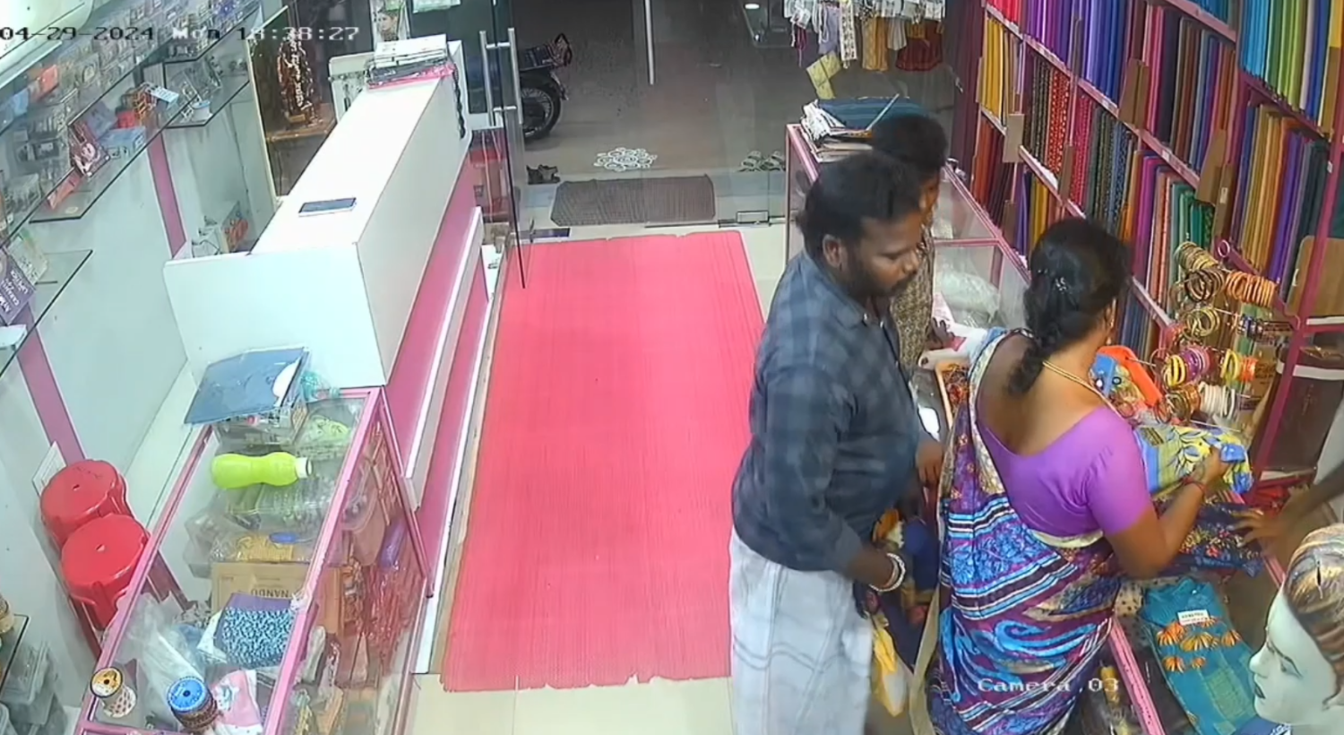 அப்போது அவர்களுடன் வந்த கைலி கட்டிக்கொண்டு, கட்டம் போட்ட சட்டை போட்டிருந்த ஆண் சேரில் உட்கார்ந்து கொண்டு கடையின் உள்ள ரேக்கின் கீழே இருந்து புடவை ஒன்றை எடுத்து தான் வைத்திருந்த கட்டை பைக்குள் வைக்கிறார். மேலும், நின்று கொண்டு துணிகளை வாங்குவது போல் பார்க்கும்போது மிக லாவகமாக அப்போதும் ஒரு புடவையை எடுத்து பைக்குள் வைக்கிறார். இவைகள் அங்கிருந்த கண்காணிப்பு கேமராவில் பதிவாகியது. வந்தவர்கள் பெயரளவிற்கு சில பொருட்களை வாங்கிக் கொண்டு திரும்பிச் சென்றுள்ளனர்.