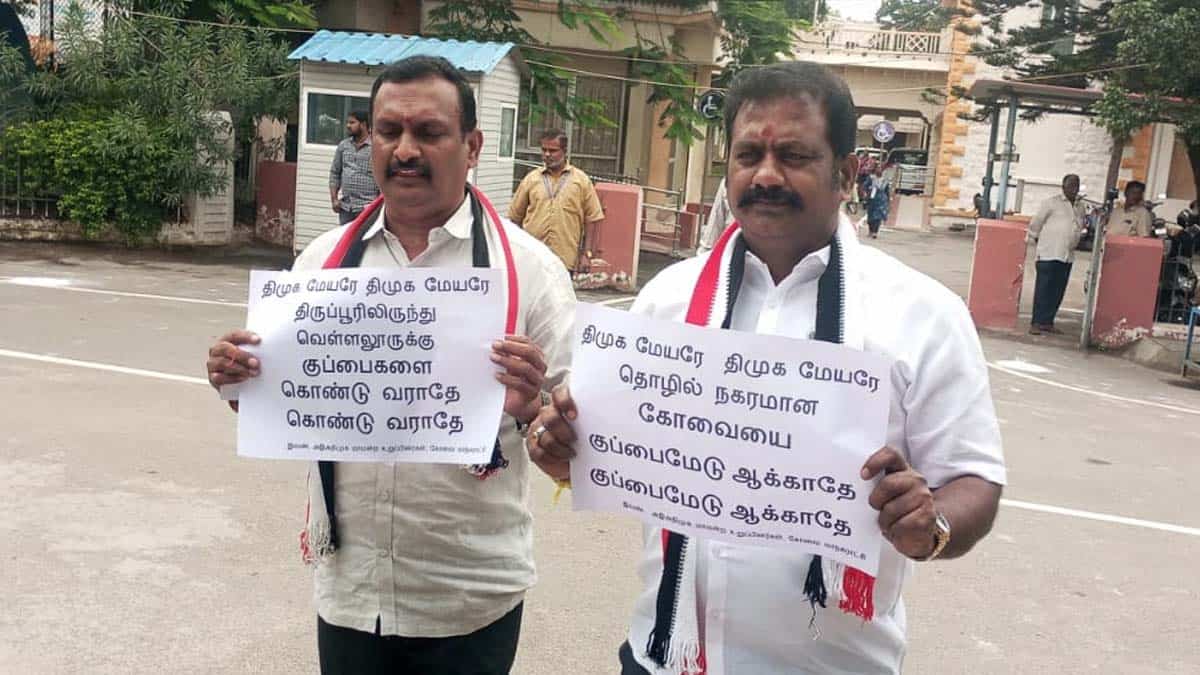 கோவை மாநகராட்சி கூட்டத்திற்கு இன்று அ.தி.மு.க கவுன்சிலர்கள் பிரபாகரன், ரமேஷ் ஆகியோர் வந்தனர். அப்போது வாசல் அருகில் “கோவை மாநகரை குப்பை கிடங்கு ஆக்காதே” என்ற வாசகங்கள் அடங்கிய பேனருடன் வந்தனர். இதனால் பரபரப்பு ஏற்பட்டது.