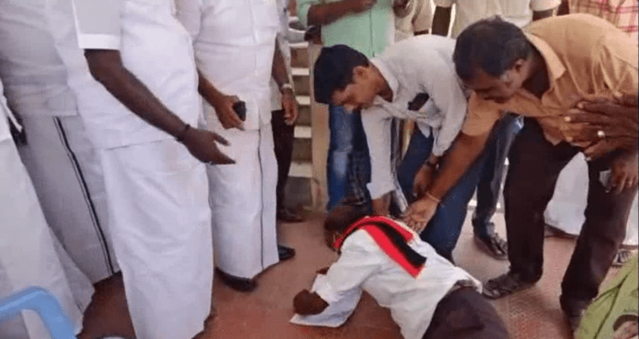 திமுக எம்பியின் காலில் விழுந்து அழுது புரண்ட மூத்த திமுக பிரமுகர் ; மக்கள் தொடர்பு முகாமில் நடந்த சம்பவத்தால் பரபரப்பு..!!