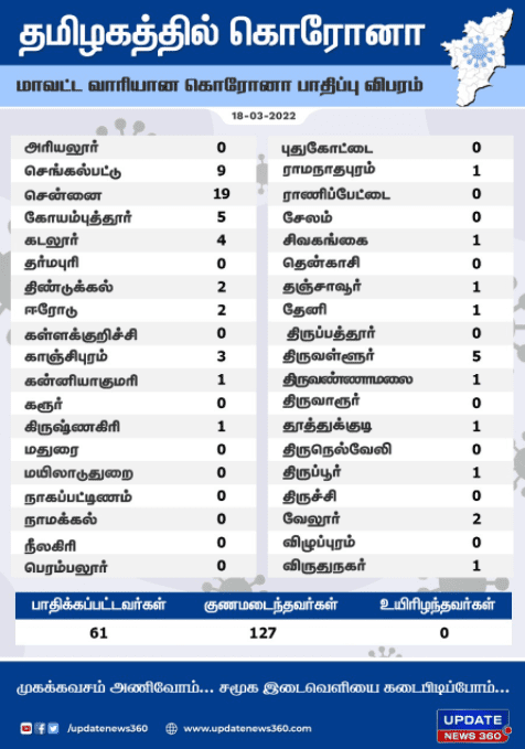 இரட்டை இலக்கு எண்களில் ஒரே ஒரு மாவட்டம்… பலி எண்ணிக்கை மீண்டும் பூஜ்ஜியம் : தமிழகத்தில் இன்றைய கொரோனா நிலவரம்!!