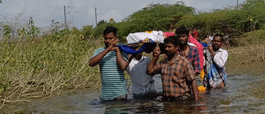இந்த சூழலில், கணேசன், சுந்தரம் என்பவரின் தாயார் அழகம்மாள் உடல் நலக்குறைவு காரணமாக இயற்கை எய்தினார். அழகம்மாளை அடக்கம் செய்வதற்காக அருகிலுள்ள சுடுகாட்டிற்கு பாதை இல்லாத நிலையில், நேற்று முன்தினம் பெய்த கனமழையால் சந்தனவர்தினி ஆற்று படுகை ஓரமாக உள்ள குளத்து கரை முழுவதும் இடுப்பளவு தண்ணீரில் அழகம்மாளின் உடலை மகன்கள் மற்றும் உறவினர்கள் சுமந்து சென்று அடக்கம் செய்த அவல நிலை ஏற்பட்டது.