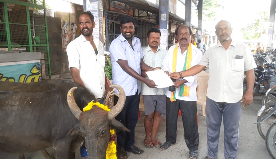 எருமை மாட்டிடம் மனு அளித்து போராட்டம்… கவனத்தை ஈர்த்த சமூக ஆர்வலரின் நூதனம்!!