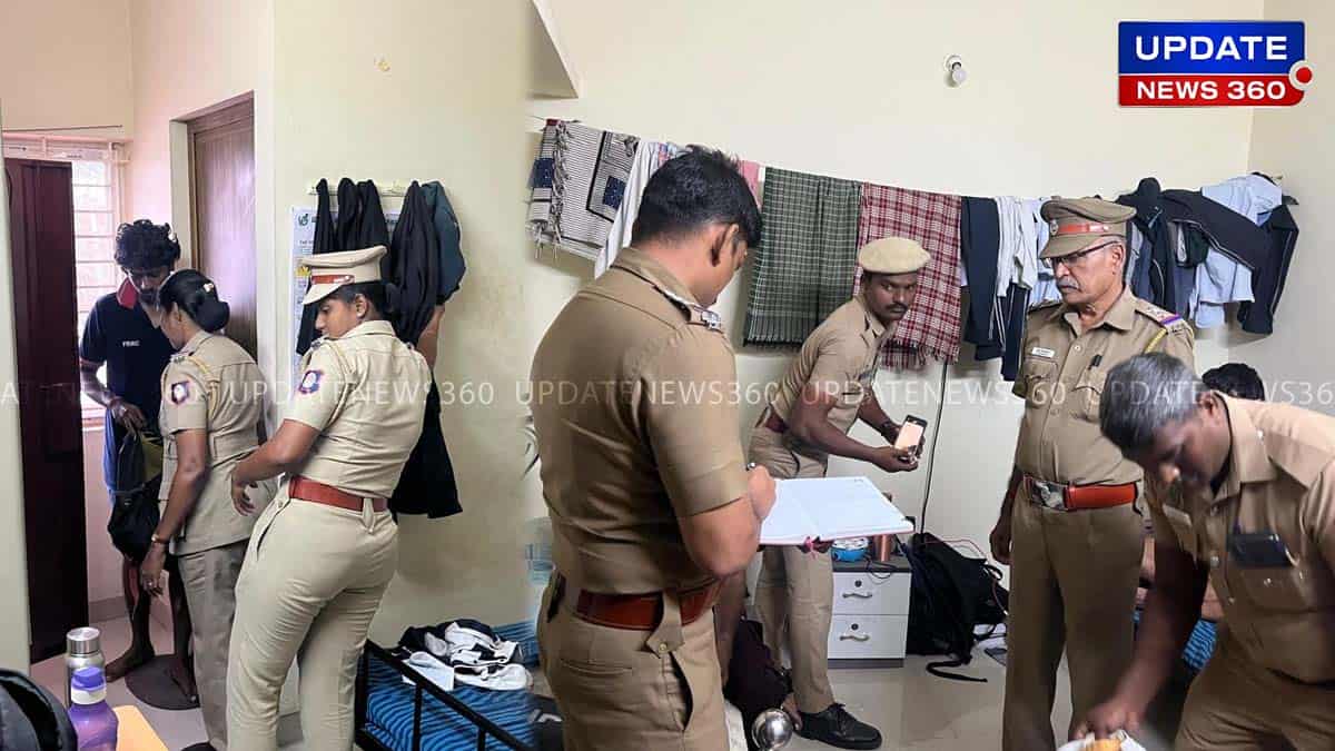 கல்லூரி மாணவர்கள் தங்கும் இடங்களில் வேறு யாரேனும் தங்கி இருக்கின்றார்களா? வேறு ஏதேனும் சட்ட விரோத பயன்பாட்டு பொருட்கள் இருக்கின்றனவா என சோதனையிட்டனர்.