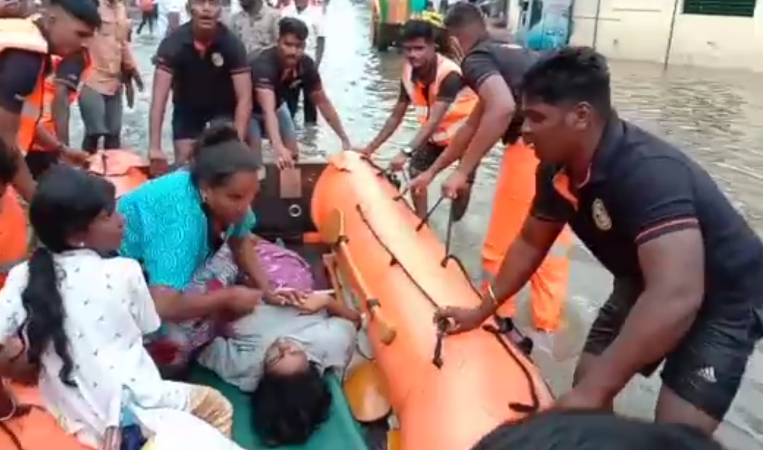 உடனடியாக மருத்துவமனை உள்ளே இருந்து வந்த தமிழ்நாடு பேரிடர் மீட்பு குழுவினர் குட்டியானை-யில் பாதி குழந்தை வெளியே வந்த நிலையில் இருந்த கர்பகவள்ளியை மீட்டு ரப்பர் படகு மூலம் தூத்துக்குடி அரசு மருத்துவமனைக்குள் அனுப்பி வைத்தனர்.
