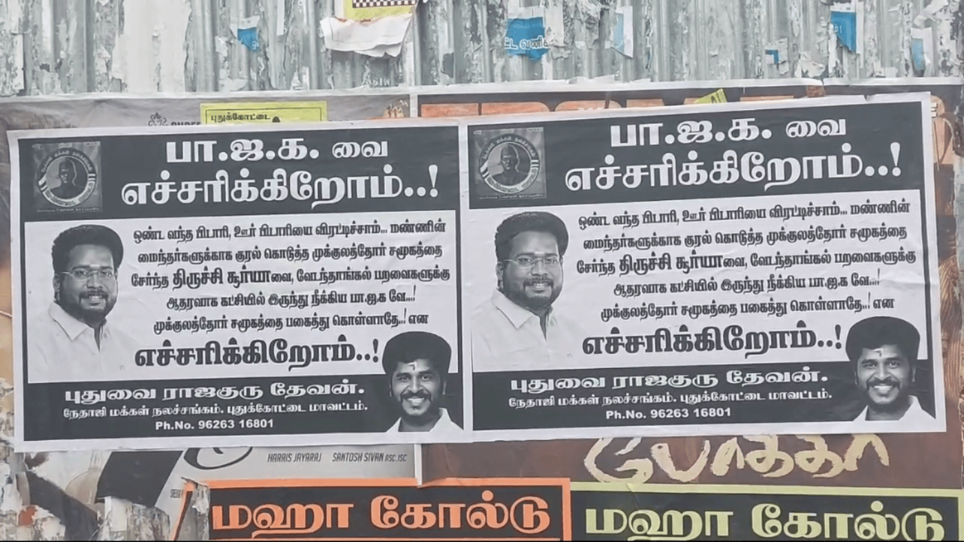 ஒட்ட வந்த பிடாரி ஊர் பிடாரியை விரட்டிச்சாம், மண்ணின் மைந்தனுக்கான குரல் கொடுத்த முக்குலத்தோர் சமுதாயத்தைச் சேர்ந்த திருச்சி சூர்யாவை வேடந்தாங்கல் பறவைகளுக்கு ஆதரவாக கட்சியிலிருந்து நீக்கிய பாஜக, எங்க கிட்ட பகைச்சுக்க வேண்டாம் என எச்சரிக்கிறோம் என்று எழுதப்பட்ட போஸ்டர் புதுக்கோட்டை நகர் முழுவதும் ஒட்டப்பட்டுள்ளன. புதுக்கோட்டை நேதாஜி மக்கள் நல சங்கம் சார்பில் புதுவை ராஜகுருதேவன் என்பவரது பெயரில் இந்த எச்சரிக்கை நோட்டீஸ் ஒட்டப்பட்டுள்ளன. பாஜகவில் நடைபெறும் உட்கட்சி பூசலால் தினம் தினம் ஒருவர் பாஜகவில் இருந்து நீக்கப்படுகிறார் என்று பாஜக வினர் கூறுகின்றனர்.