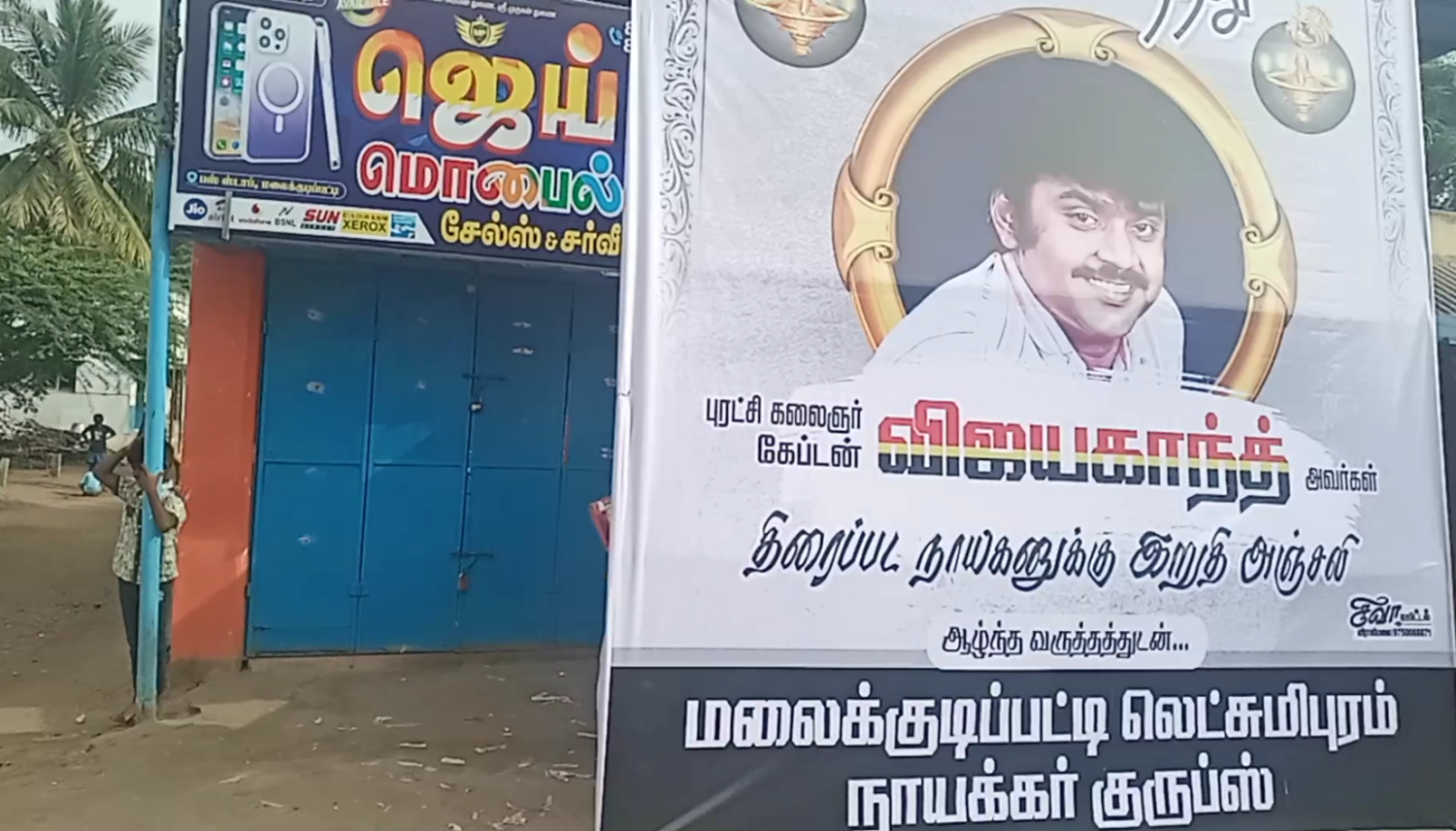 தமிழகம் முழுவதும் பல்வேறு இடங்களில் அவரது திருவுருவ படத்திற்கு மாலை அணிவித்து கண்ணீர் அஞ்சலி செலுத்தி வருகின்றனர். அந்த வகையில், புதுக்கோட்டை மாவட்டம் விராலிமலை அருகே உள்ள மலைக்குடிபட்டியில் விஜயகாந்துக்கு அஞ்சலி செலுத்தும் விதமாக, வணிக கடைகளை அடைத்து அஞ்சலி செலுத்தி வருகின்றனர்.