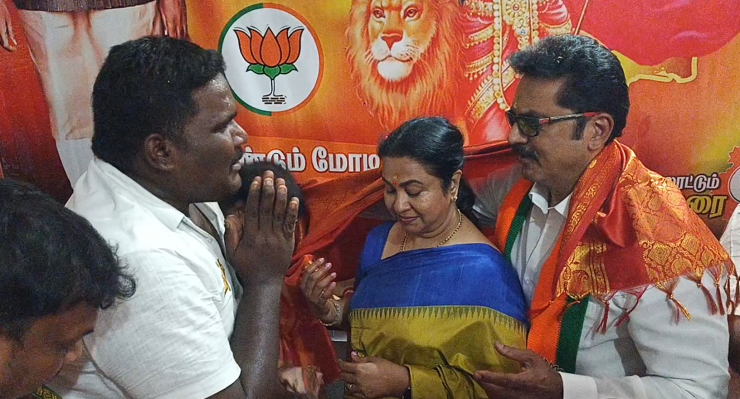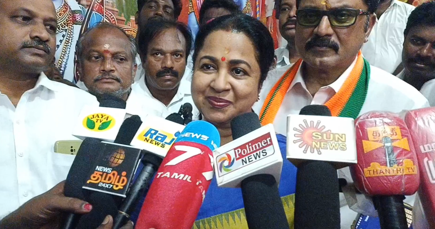 சிவகாசியில் பாஜக தேர்தல் அலுவலகம் திறப்பு விழாவில் பங்கேற்ற பாஜக வேட்பாளர் ராதிகா சரத்குமார் செய்தியாளர்களை சந்தித்தார்.