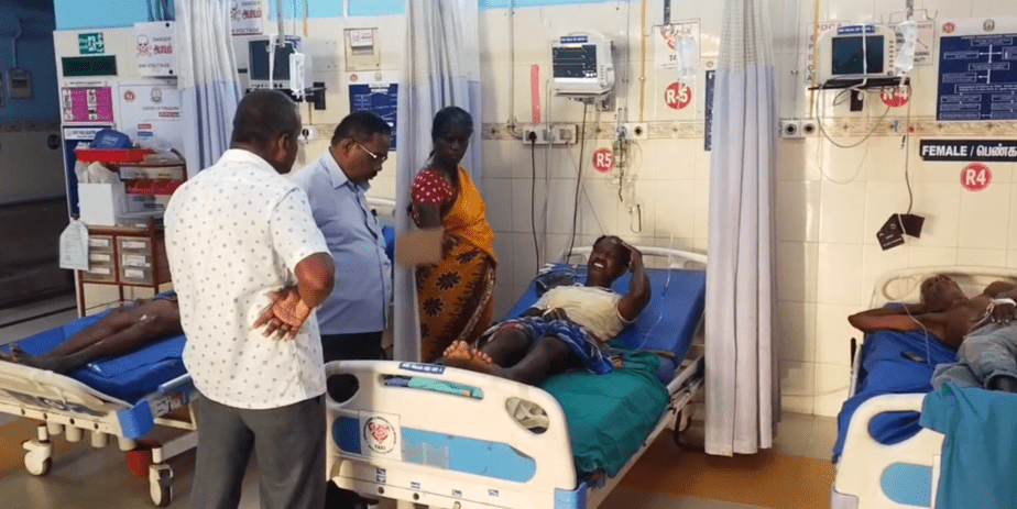 இதனால், படுகாயம் அடைந்த செல்வராஜ் மற்றும் ராதாகிருஷ்ணன் உள்ளிட்ட ஐந்து பேர் உடனடியாக வாலாஜாபேட்டை அரசு மருத்துவமனைக்கு ஆம்புலன்ஸ் மூலம் சிகிச்சைக்காக கொண்டு செல்லப்பட்டனர். இதில் செல்வராஜ் மற்றும் ராதாகிருஷ்ணன் ஆகியோர் உயிருக்கு ஆபத்தான நிலையில், அங்கிருந்து தனியார் மருத்துவமனைக்கு சிகிச்சைக்காக மாற்றம் செய்யப்பட்டனர்.