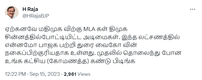 இந்த நிலையில் துரைவைகோவின் பேச்சுக்கு பாஜக மூத்த தலைவர் ஹெச் ராஜா கண்டனம் தெரிவித்துள்ளார். இது குறித்து அவர் தனது எக்ஸ் தள பக்கத்தில், ஏற்கனவே மதிமுக விற்கு MLA கள் திமுக சின்னத்தில் போட்டியிட்ட அடிமைகள். இந்த லட்சணத்தில் என்னமோ பாஜக பற்றி துரை வைகோவின் பேச்சு நகைப்பிற்குரியதாக உள்ளது. முதலில் தொலைந்து போன உங்க கட்சிய (கோமணத்த) கண்டு பிடிங்க என கடுமையாக விமர்சித்துள்ளார்.