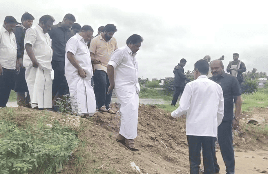 ஏ ரெட்டிபாளையம் பகுதிகளை பத்திர பதிவுத்துறை அமைச்சர் மூர்த்தி மாவட்ட ஆட்சியருடன் நேரில் பார்வையிட்டு ஆய்வு செய்து முன் எச்சரிக்கை நடவடிக்கைகள் மூட்டைகள் அடுக்கி வைக்கப்பட்டிருப்பதை பார்வையிட்டனர்.