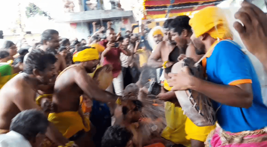 அதனைத்தொடர்ந்து கோவில் பூசாரி ஆணி அடித்த காலணி அணிந்து ஆசி வழங்கினார். அதன் பின்னர் கோவில் முன்பாக வரிசையாக உட்கார்ந்திருந்த பக்தர்களின் தலையில் ஒவ்வொரு தேங்காயாக உடைத்தார்.