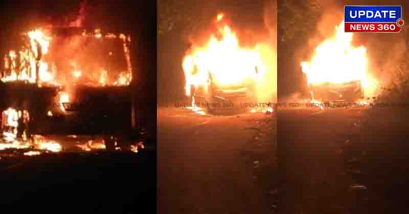 மின் கசிவு காரணமாக எரிந்து சாம்பலான சுற்றுலா பேருந்து. அதிர்ஷ்டவசமாக உயிர் தப்பிய 24 பயணிகள்.