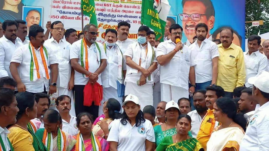 பெட்ரோல் டீசல் மற்றும் கியாஸ் விலையை கட்டுப்படுத்த கோரியும், ஜி.எஸ்.டி வரியை குறைக்க கோரியும் கோவையில் இருந்து காங்கிரஸ் கட்சி சார்பில் 56 பேர் கோவையிலிருந்து சென்னைக்கு 18 நாட்கள் 550 நடைபயண பேரணி மேற்கொள்கின்றனர்.