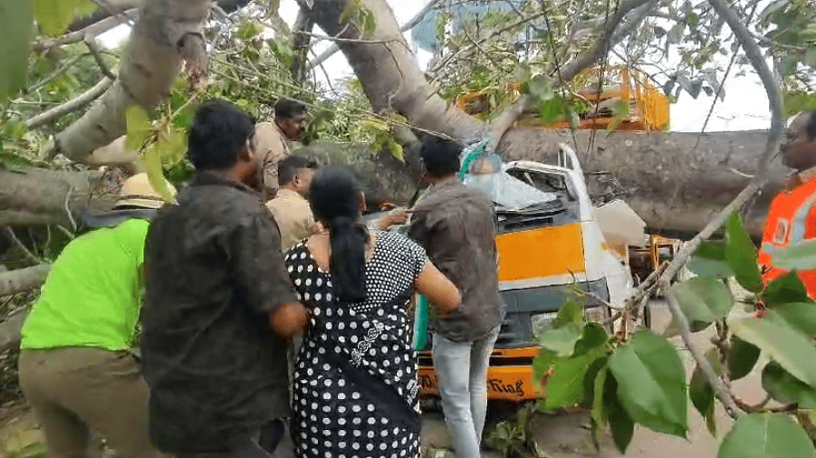 பலத்த சத்தத்துடன் மரம் விழுந்ததில், லாரியின் உள் இருந்த பாளையம் பகுதியை சேர்ந்த ஓட்டுநர் மாரப்பா(45), வெங்கடேஷ்(34) ஆகியோர் வாகனத்திற்குள் சிக்கி உடல்நசுங்கி உயிரிழந்தார்..