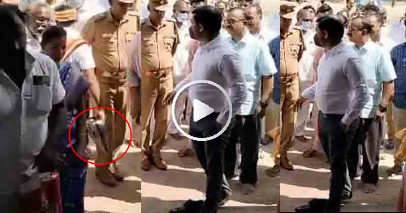 அதனை தொடர்ந்து காலணிகளை அவரது உதவியாளர் எடுத்துச் சென்றார். இந்த சம்பவதை பார்த்த ஆய்வுக்காக காத்திருந்த மற்ற அரசு அதிகாரிகள் மற்றும் பொதுமக்களிடையே பெரும் அதிர்ச்சியை ஏற்படுத்தியுள்ளது.