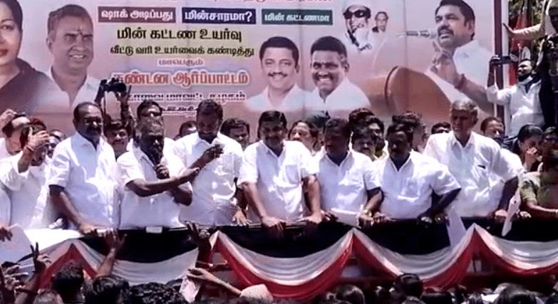 இதைத்தொடர்ந்து மின்கட்டணத்தை திரும்ப பெற வேண்டும், வரி உயர்வை நிறுத்தி வைக்க வேண்டும் என வலியுறுத்தி கோஷம் எழுப்பினர்.
