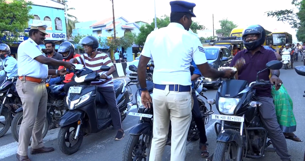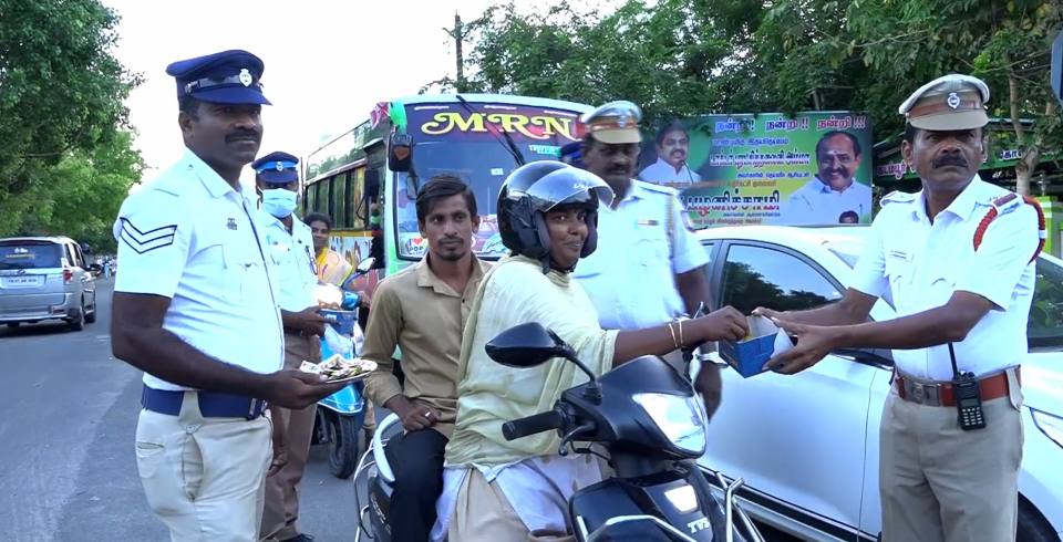 அதாவது, ஹெல்மேட் அணிந்து இருசக்கர வாகனம் ஓட்டியவர்களையும், சீட் பெல்ட் அணிந்து கார் ஓட்டி வந்த வாகன ஓட்டிகளையும் பாராட்டிய போக்குவரத்து காவல்துறையினர், அவர்களுக்கு லட்டு, சாக்லெட் கொடுத்து நன்றி கூறி உற்சாகப்படுத்தினர். மேலும், போக்குவரத்து விதிமுறைகளை பின்பற்றாமல் வழக்கம் போல ஹெல்மெட் போடாமல், சீட் பெல்ட் அணியாமல் வாகனங்களை ஓட்டி வந்தவர்களை நிறுத்தி அறிவுரைகளை கூறி, விதிமுறைகளை கடைபிடிக்கும்படி கேட்டுக்கொண்டனர்.