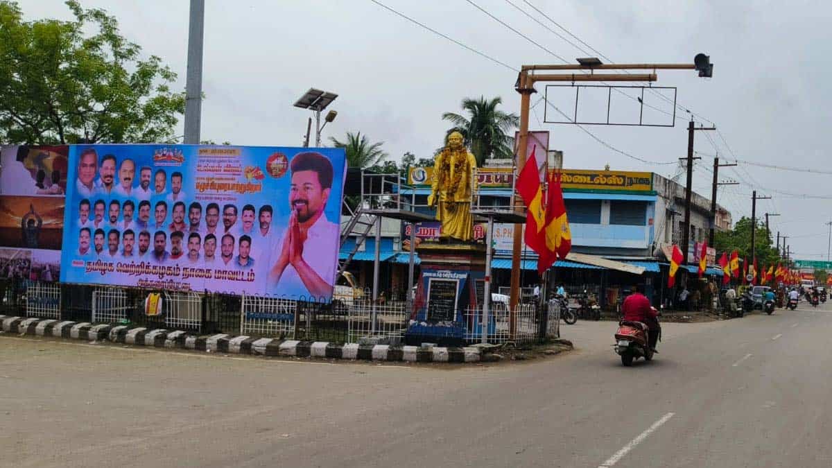 சாலைகள் இருபுறங்களிலும் கொடிக்கம்பங்கள் அமைக்கும் பணியும் விளம்பர பதாகைகள் உள்ளிட்ட பணிகளில் தமிழக வெற்றிக்கழக நிர்வாகிகள் ஈடுபட்டு வருகின்றனர்.