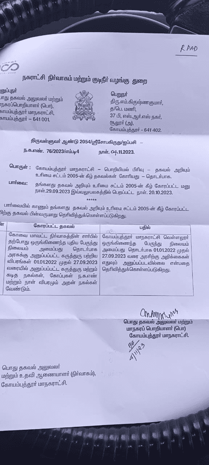 ஆனால் தற்போது தகவல் அறியும் உரிமை சட்டத்தின் கீழ் தொடர்பு கொண்டதில் அதிர்ச்சி தகவல் வெளியாகியுள்ளது. அதில் கடந்த 2 வருடங்களாக கோவை மாநகராட்சி, வெள்ளலர் பேருந்து நிலையம் தொடர்பாக எந்த அறிக்கையும் இதுவரை தமிழக அரசுக்கு அனுப்பவில்லை என தெரியவந்துள்ளது.