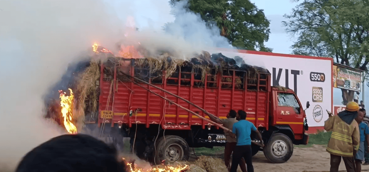 ஓடும் லாரியில் பற்றி எரிந்த வைக்கோல்.. துரிதமாக செயல்பட்டு சீறிப்பாய்ந்த லாரி ஓட்டுநர்..!