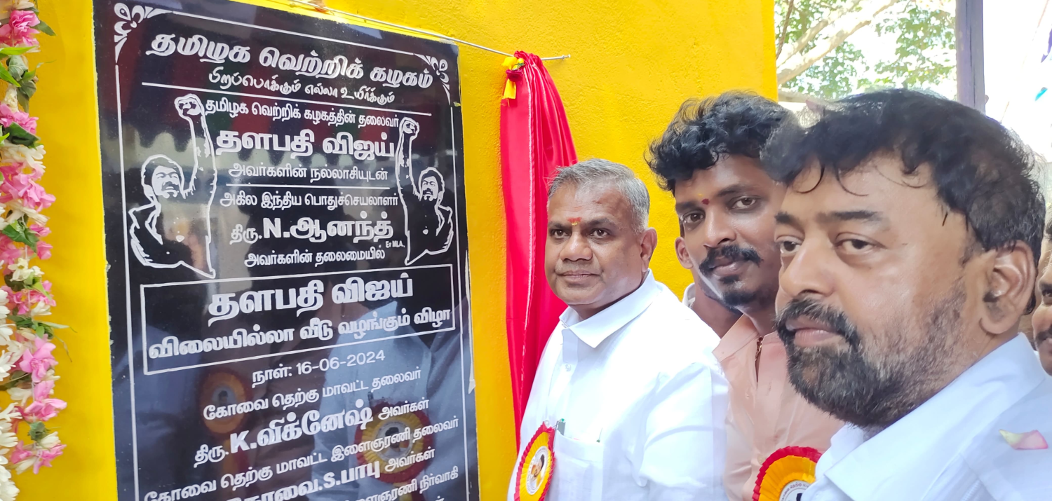 கோவையில் தமிழக வெற்றிக் கழகத்தின் தெற்கு மாவட்ட இளைஞரணியினர் தளபதி விலையில்லா வீடு வழங்கும் திட்டம் மூலமாக மாற்றுத்திறனாளி குழந்தையின் குடும்பத்திற்கு வீடு கட்டி கொடுத்து , வீட்டு உபயோகப் பொருட்களையும் வழங்கி அசத்தியுள்ளனர்.